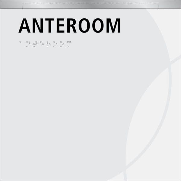 ID.4030 Room ID – Clear Acrylic Panel, Custom Tab Top, Face/Sides Painted 2 Colors, Applied Tactile, Clear Braille, VHB Mount, 0.375″ Brushed Alum. Accent Bar, Routed Channel, Clearcoat, Perm. Mount to Panel