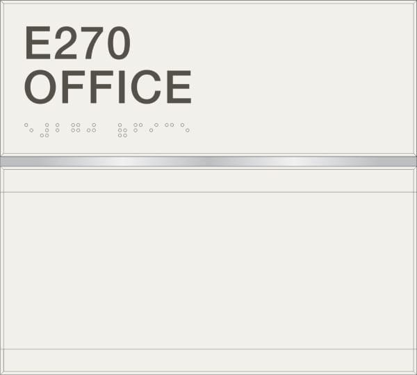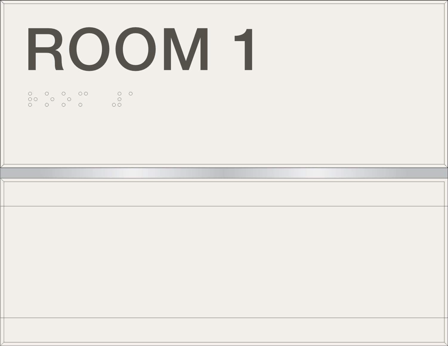 3050.10ID Room ID with Insert – Photopolymer Top Panel, Beveled Edges, Face/Sides Painted, Raised Copy, Tipped, Painted Braille, Clearcoat, Perm. Mount to Backer, 0.1875″ x 8″ x 0.125″ Brushed Alum.. Accent Bar, Clearcoat, Perm. Mount to Backer, 3.3″ x 8″ x 0.125″ Clear NG Acrylic Lens, Unpainted, (2) Routed Channels, Beveled Edges, (2) 0.5″ x 8″ x 0.125″ Clear Acrylic Insert Rails, Routed Channels, Beveled Edges, Face/Sides Painted, Solvent Weld to Insert Backer, 4″ x 8″ x 0.0625″ Clear Acrylic Insert Backer, Routed Channels, Beveled Edges, Face/Sides Painted, Clearcoat, Perm. Mount to Backer, 7.1875″ x 8″ x 0.0625″ Clear Acrylic Back Panel, Face/Sides Painted, VHB Mount