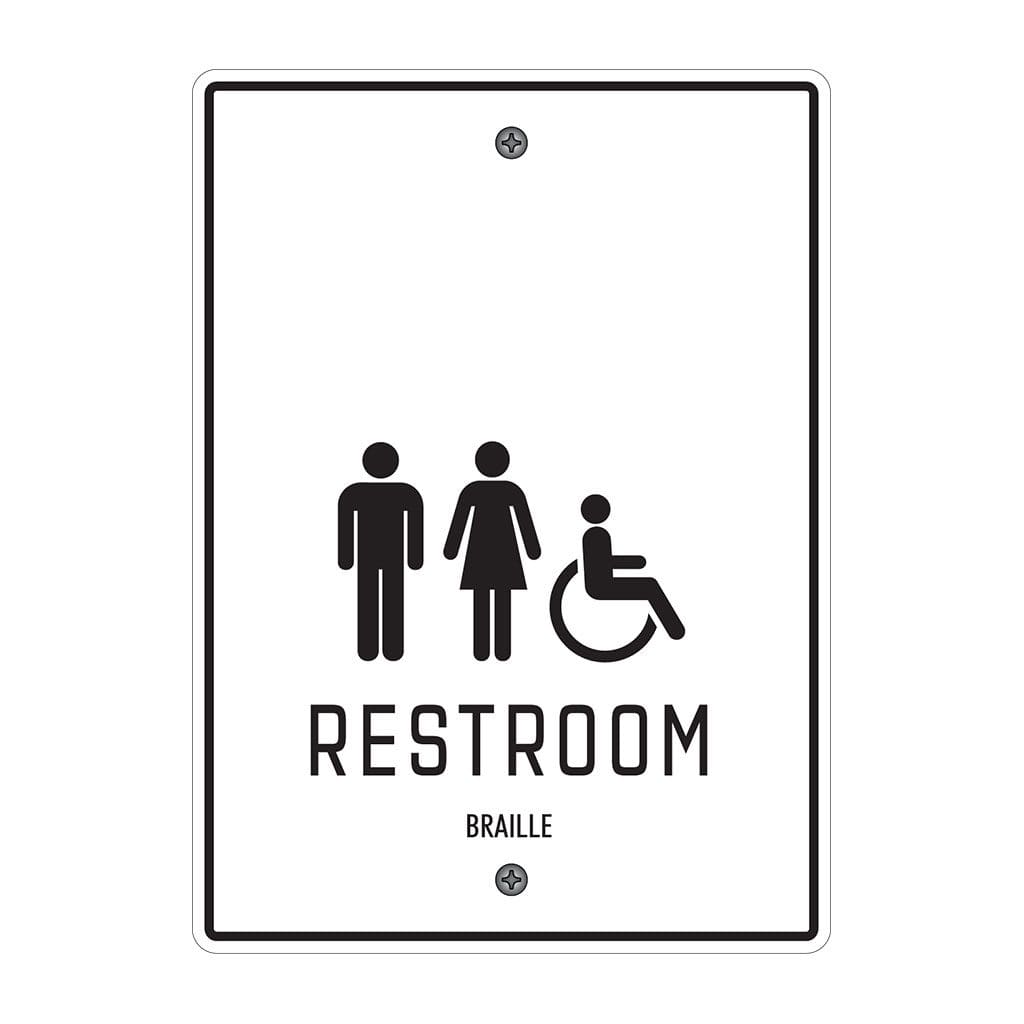 Mark each bathroom with a restroom identification sign. Restroom signs feature raised text, symbols and Grade 2 Braille. Signs come with mounting hardware and are for interior use only.