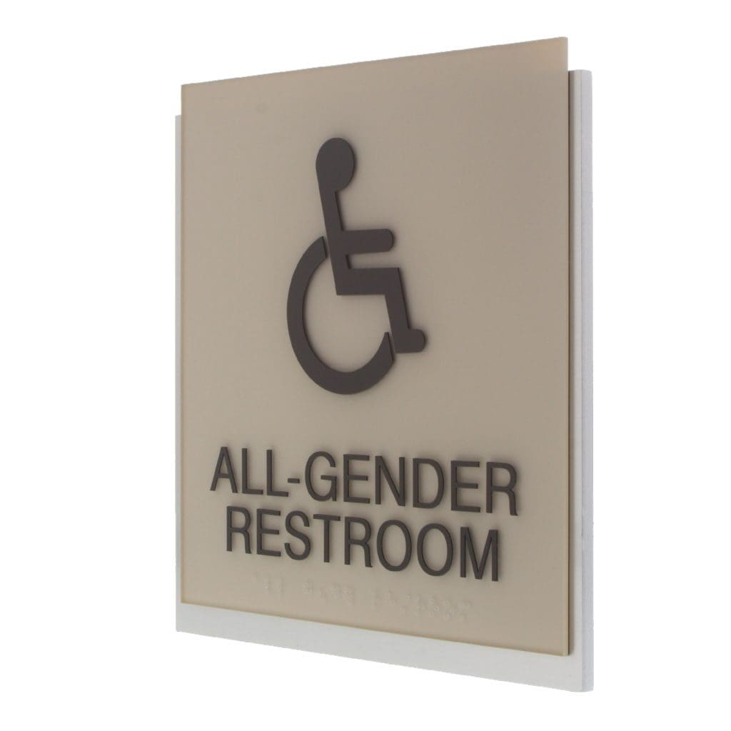 Mark each bathroom with a restroom identification sign. Restroom signs feature raised text, symbols, Grade 2 Braille and come with foam tape on the back for easy installation
