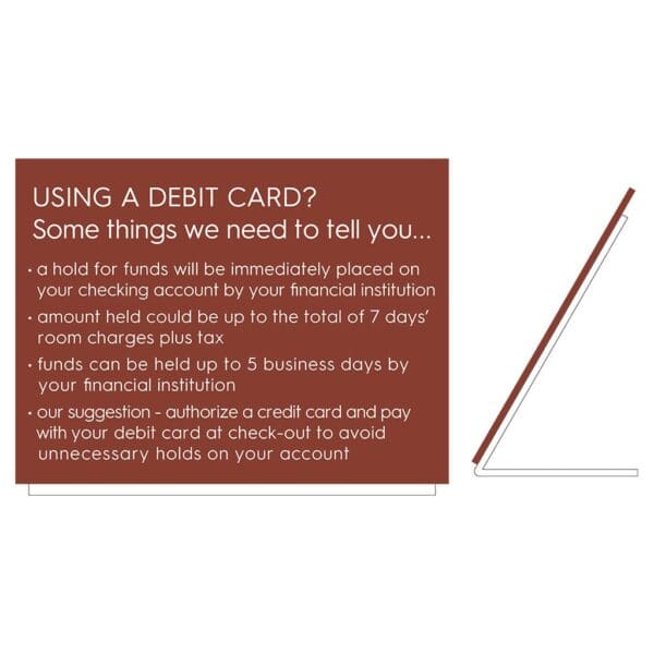 Informational signs use text and symbols to display need to know information quickly and easily to guests and employees. Sign comes on a bend stand in order to sit on a flat service. This sign is for interior use only.
