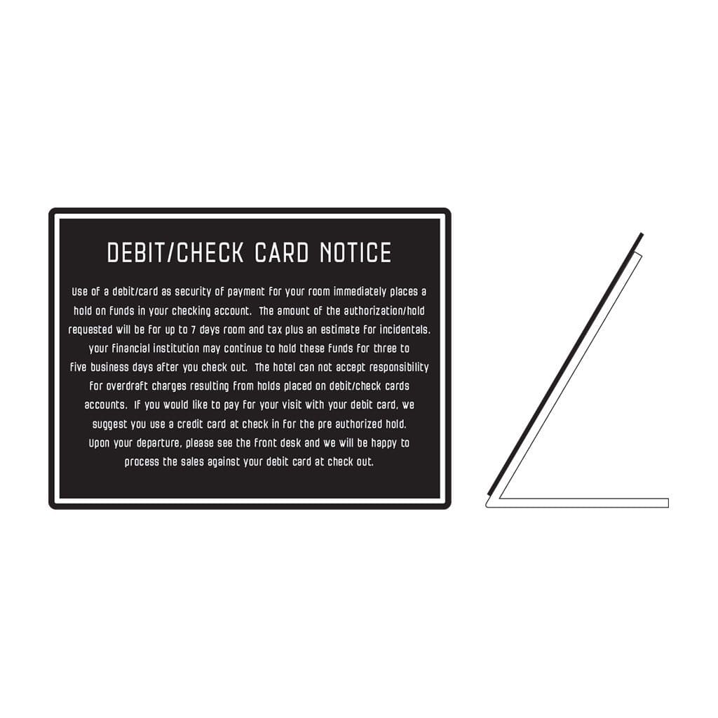 Let customers know your policy on debit and credit cards by displaying this sign prominently at your check-in counter. Sign comes on a bent stand so it can sit directly on the front desk.