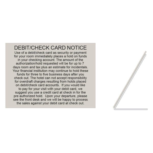Inform guests of your debit and credit card policy with brand-approved Debit/Check Card Informationals. Sign had rubber feet to sit on check-in counter and flat copy.