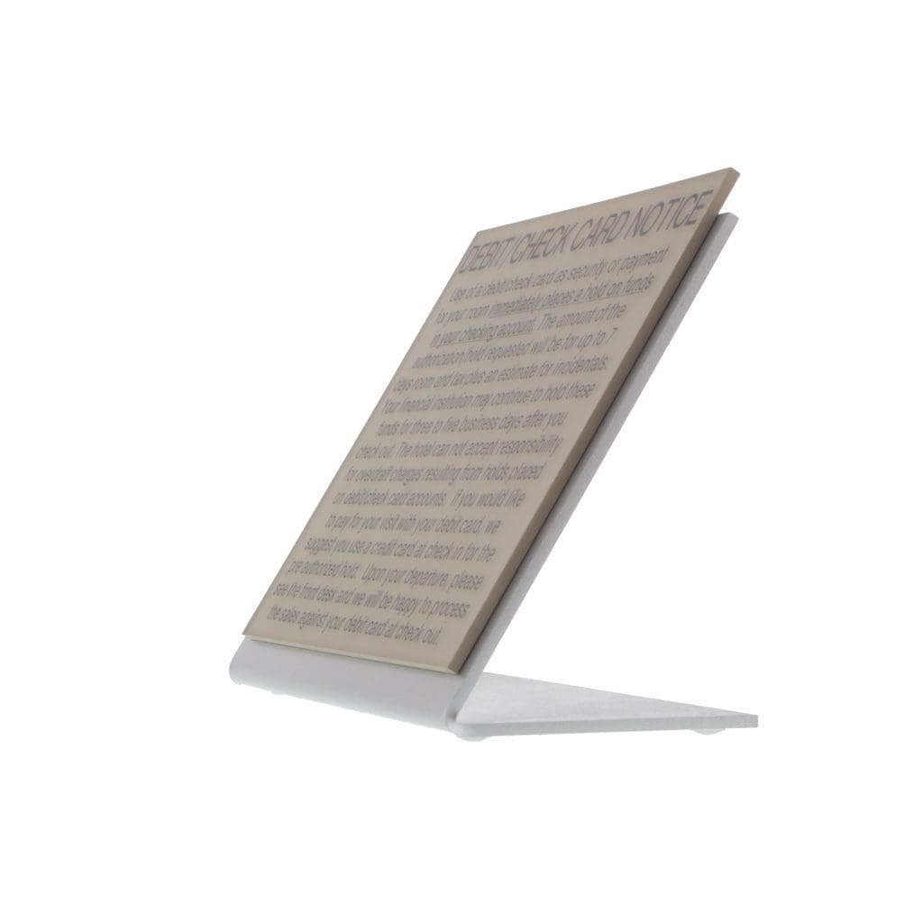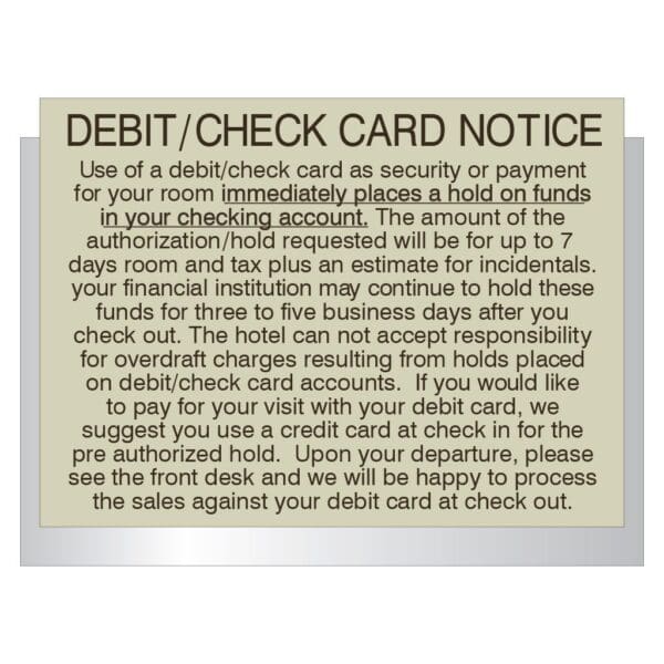 Let customers know your policy on debit and credit cards by displaying this sign prominently at your check-in counter.