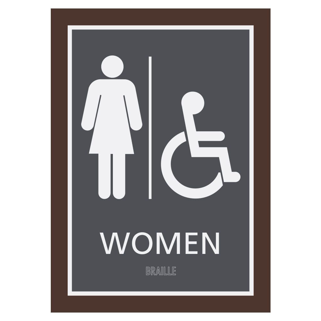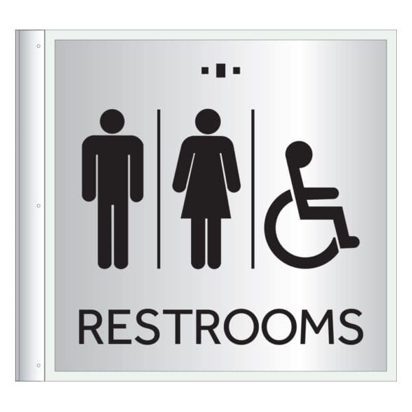 Double-sided restroom sign is used to help guests and employees find their intended destination. Sign is mounted to the wall and contains identical tactile text on both sides. Signs come with mounting hardware and are for interior use only.