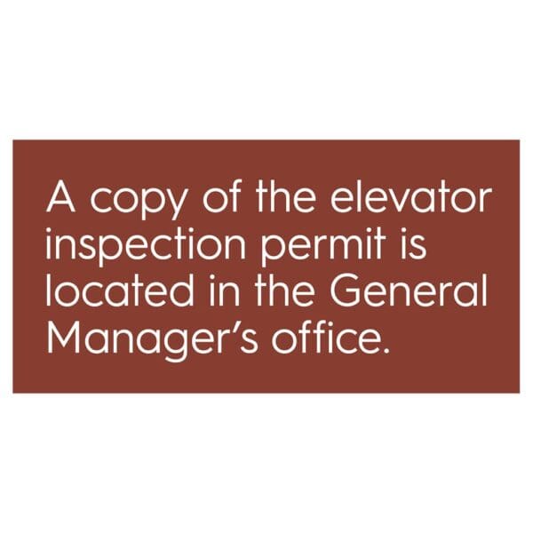 Put your guests at ease while riding the elevator with brand-approved elevator inspection signs. Text is digitally printed and mounted with foam tape. Sign is made with photopolyer and for interior use only.