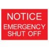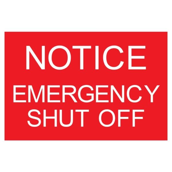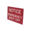 Red informational safety sign that denotes the emergency shut off, featuring digitally printed text.
