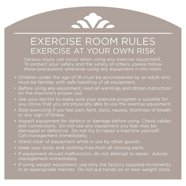 Brand-Approved exercise room rules signs ensure that your guests remain safe and informed while using the hotel exercise room. Text on sign is flat and is for interior and exterior use. Comes with foam tape for mounting.