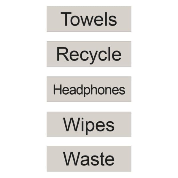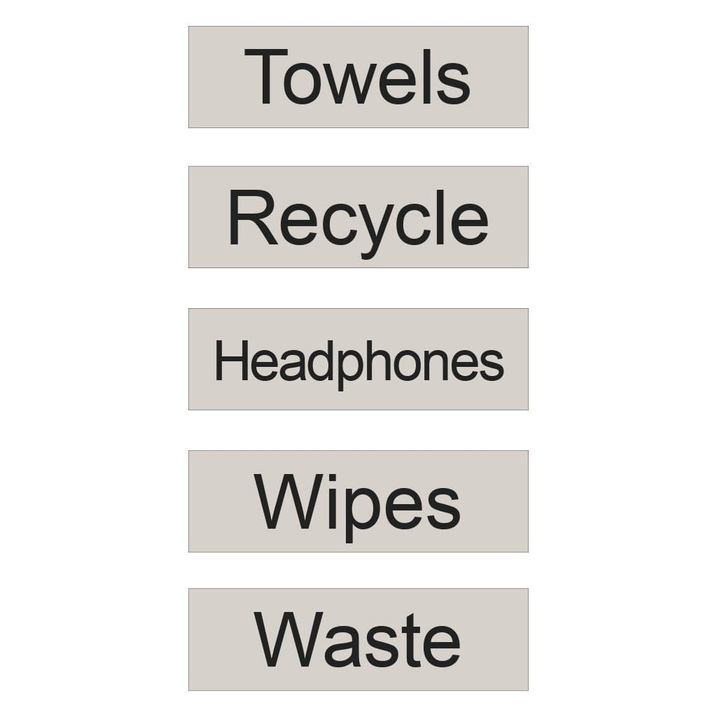 Use bin labels to let guests know where to find things when utilizing the hotel gym. Fitness Center labels are sold in a pack of 5 and include: Towels, Recycle, Headphone, Wipes and Waste.
