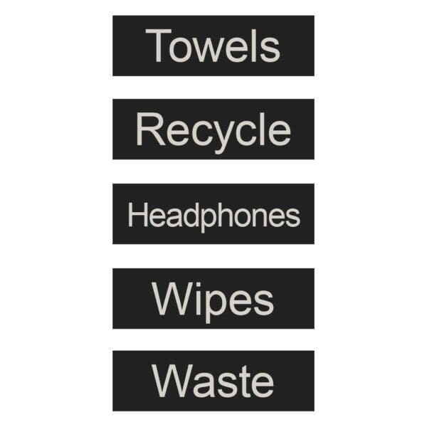 Use bin labels to let guests know where to find things when utilizing the hotel gym. Fitness Center labels are sold in a pack of 5 and include: Towels, Recycle, Headphone, Wipes and Waste.