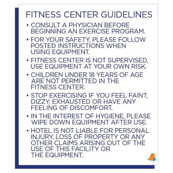Keep guests safe while using the fitness center with brand-approved fitness center rule signs. Signs feature flat text and come with foam tape on the back for mounting.