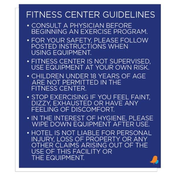 Keep guests safe while using the fitness center with brand-approved fitness center rule signs. Signs feature flat text and come with foam tape on the back for mounting.