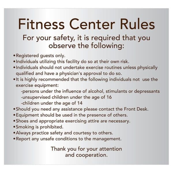 Keep guests safe while using the fitness center with brand-approved fitness center rule signs. Signs feature flat text and come with foam tape on the back for mounting.
