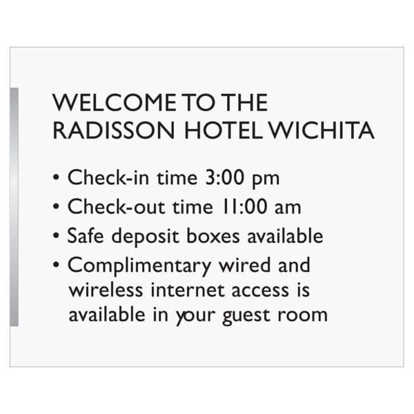 Keep guests inform of hotel policies and rules with brand-approved front desk informational sign. Sign features flat text and comes with foam tape on the back for mounting. For interior use only.