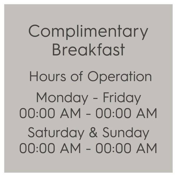 Let guest know when and where they can expect breakfast at your hotel with brand-approved signage. Breakfast sign is made with tactile copy and braille for ADA Compliance. Sign is made with vandal-proof photopolymer for interior and exterior use. Comes with foam tape on the back for easy mounting.