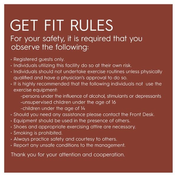 Brand-Approved Fitness center rules signs ensure that your guests remain safe and informed while using the hotel gym. Text on sign is flat and is for interior use only. Comes with foam tape for mounting.