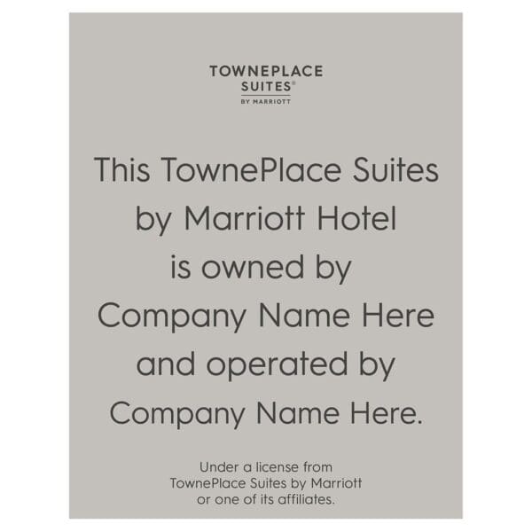 Specify the owner and operator of your hotel with brand-approved Owner and Operator signage. Sign features flat copy and comes with foam tape on the back for easy mounting. For interior use only.