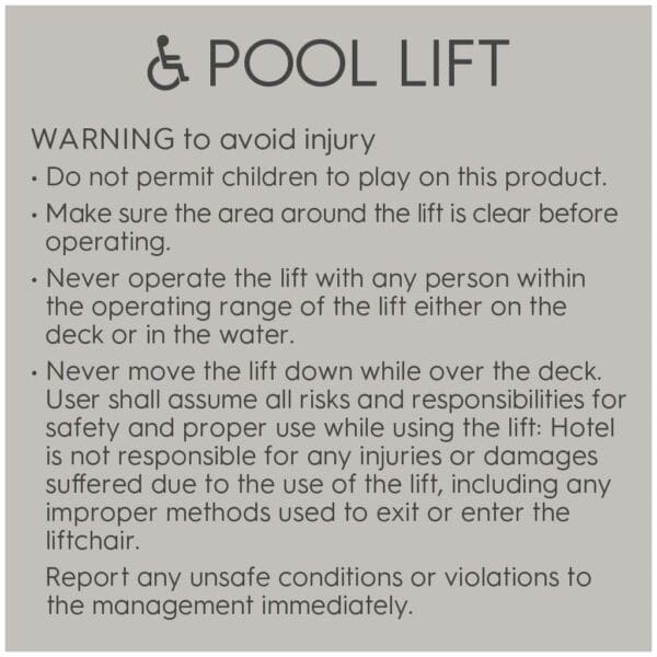 Brand-Approved Pool Lift signs ensure that your guests remain safe and informed while using the hotel pool. Text on the sign is printed flat and is used for exterior use only. Use the selection below to choose wall mount or post/fence mount (hardware provided).