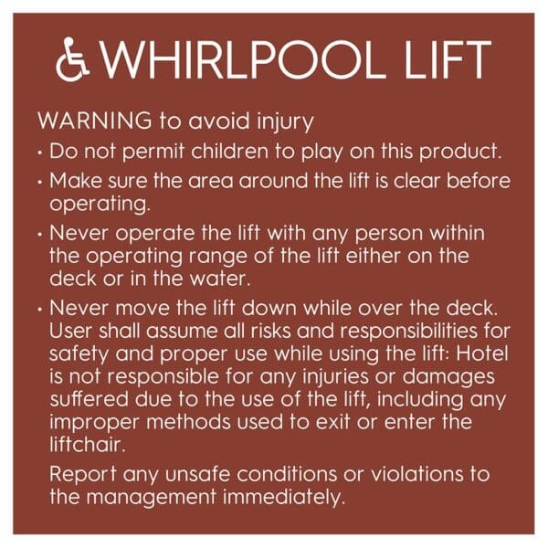 Brand-Approved Spa Lift signs ensure that your guests remain safe and informed while using the hotel pool. Text on the sign is printed flat and is used for exterior use only. Use the selection below to choose a wall mount or post/fence mount (hardware provided).