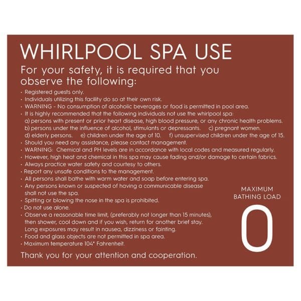 Brand-Approved Spa Rules signs ensure that your guests remain safe and informed while using the hotel pool. Text on sign is flat and is for exterior use only. See below to select between a wall mount or a post/fence mount (hardware provided).