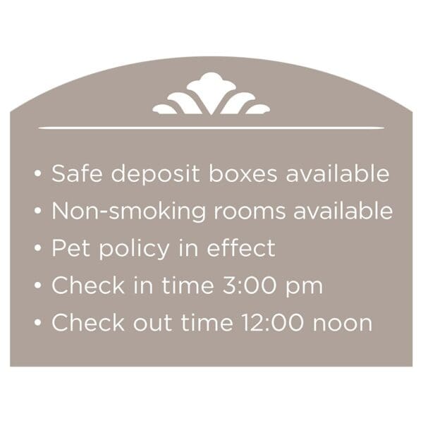 Keep guests inform of hotel policies and rules with brand-approved front desk informational sign. Sign features flat text and comes with foam tape on the back for mounting. For interior use only.