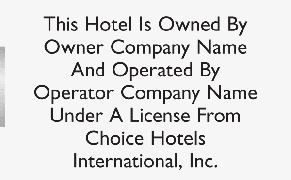 Specify the owner and operator of your hotel with brand-approved Owner and Operator signage. Sign features flat copy and comes with foam tape on the back for easy mounting. For interior use only.