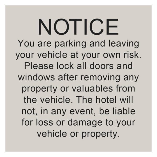 Brand-approved Parking Notice signs come with flat text and ensure your guests are complying with hotel parking policies. Use the selection below to choose wall mount or post/fence mount (hardware provided). For interior and exterior use.