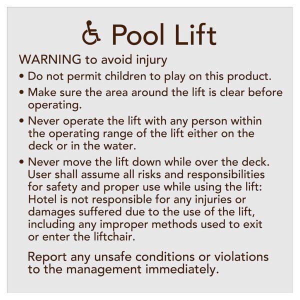 Brand-Approved Pool Lift signs ensure that your guests remain safe and informed while using the hotel pool. Text on the sign is printed flat and is used for exterior use only. Use the selection below to choose wall mount or post/fence mount (hardware provided).