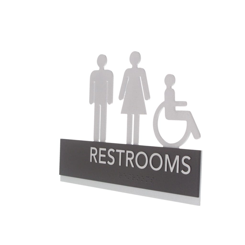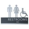 Mark each bathroom with a restroom identification sign. Restroom signs feature raised text, symbols, Grade 2 Braille and come with foam tape on the back for easy installation.