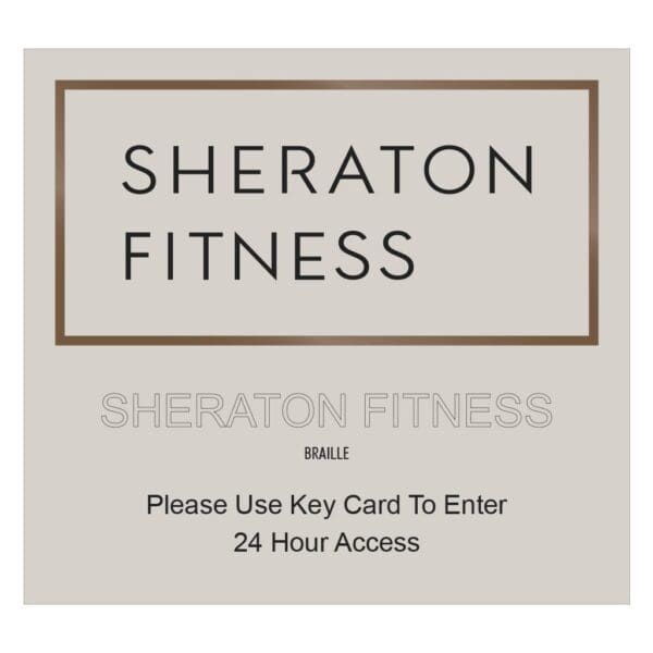 Room ID Sign denoting the Sheraton fitness center. Sign is ADA-Compliant, featuring tactile copy, braille and foam tape on the back the easy mounting.