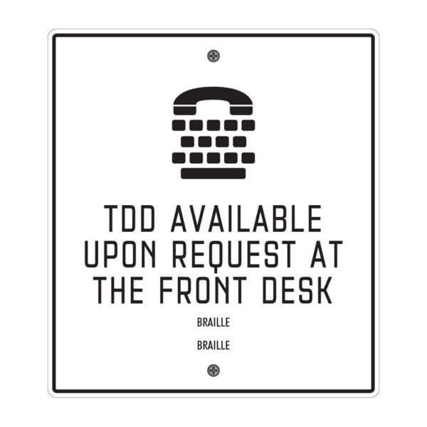 Let those with a hearing impairments know your hotel can assist them if the need to make a phone call with TTD signs. Sign in ADA-compliant, featuring tactile text and braille, and comes with mounting hardware.