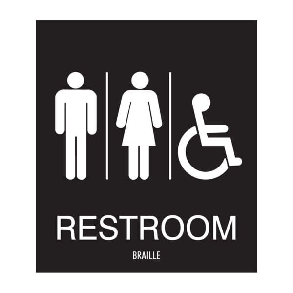 Mark each bathroom with a restroom identification sign. Restroom signs feature raised text, symbols and Grade 2 Braille. Signs come with foam tape on back for easy mounting. For interior and exterior use.