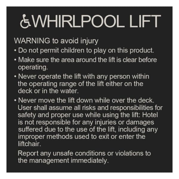 Brand-Approved Whirlpool Lift signs ensure that your guests remain safe and informed while using the hotel pool. Text on sign is flat. Use the selection below to choose wall mount or post/fence mount (hardware provided).