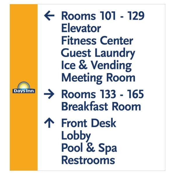 Help guests navigate your hotel easily with directional signs. Signs feature digitally printed text to display need to know information to guest quickly and easily. Each directional sign comes with foam tape on back for easy mounting. For interior and exterior use.
