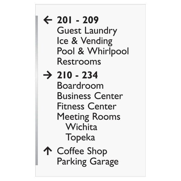 Help guests navigate your hotel easily with directional signs. Signs feature flat copy and come with foam tape for easy mounting. Directionals are for interior and exterior use.