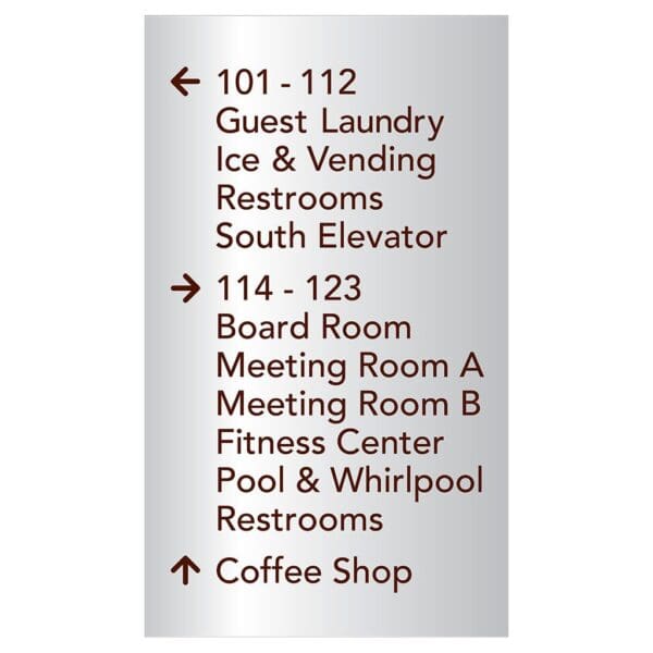 Help guests navigate your hotel easily with directional signs. Signs feature flat copy and come with foam tape for easy mounting. Directionals are for interior use only.