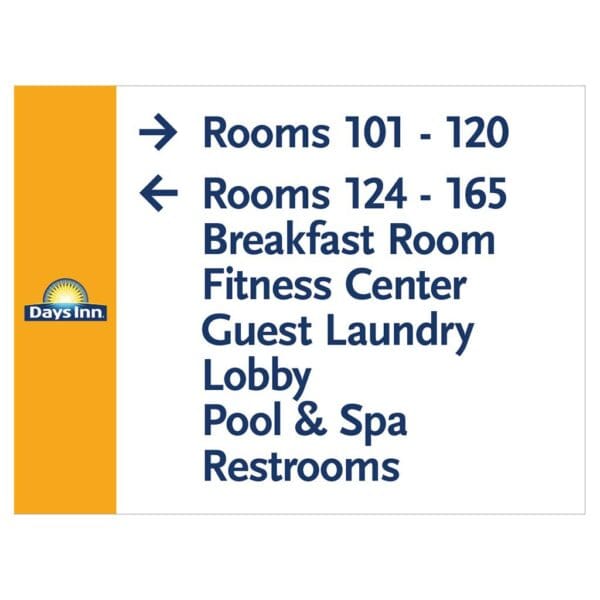 Help guests navigate your hotel easily with directional signs. Signs feature digitally printed text to display need to know information to guest quickly and easily. Each directional sign comes with foam tape on back for easy mounting. For interior and exterior use.