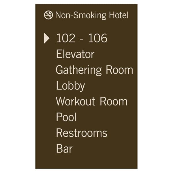 Help guests navigate your hotel easily with directional signs. Signs feature flat copy and come with foam tape for easy mounting. Directional signs are made with vandal-proof photopolymer for interior or exterior use.