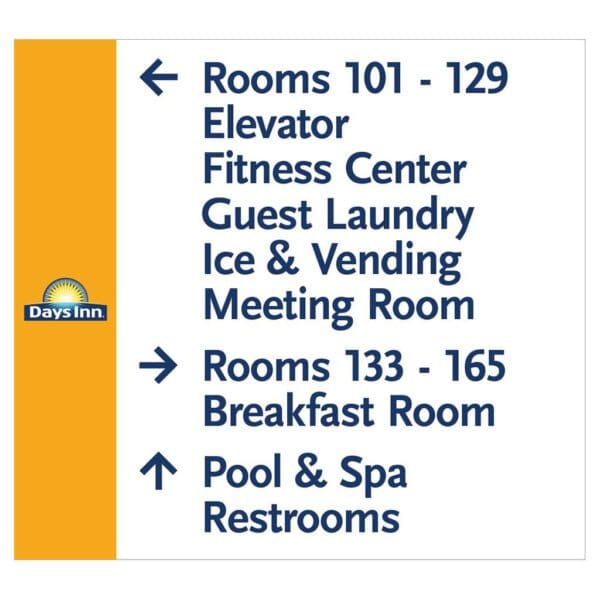 Help guests navigate your hotel easily with directional signs. Signs feature digitally printed text to display need to know information to guest quickly and easily. Each directional sign comes with foam tape on back for easy mounting. For interior and exterior use.