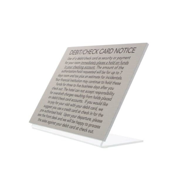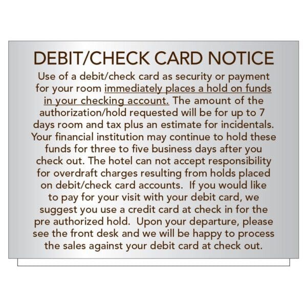Let customers know your policy on debit and credit cards by displaying this sign prominently at your check-in counter.