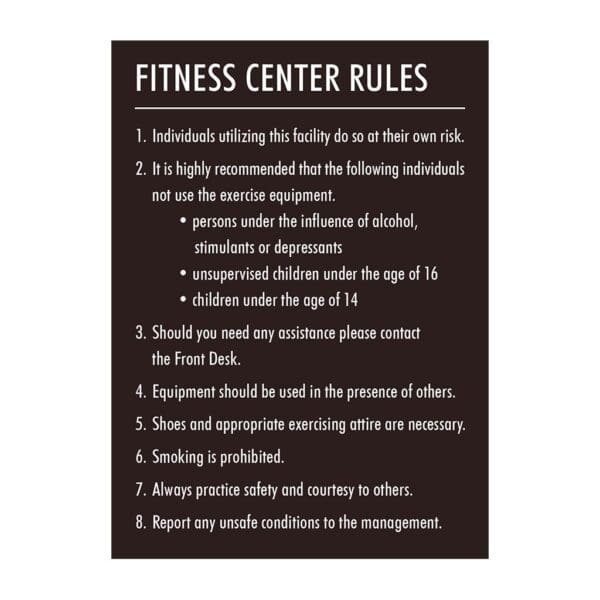 Keep guest safe and healthy while using the hotel gym by posting a brand-approved Fitness Center Rules sign in a highly visible are of the hotel gym. Sign features flat text and comes with foam tape on the back for easy mounting. For interior and exterior use.