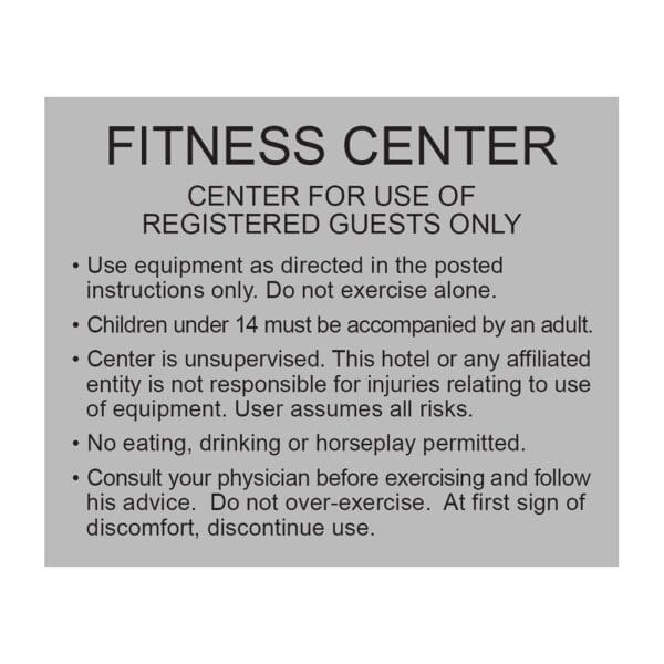 Keep guests safe while using the hotel gym with brand-approved fitness center rules signs. Text on sign is printed flat and each sign has comes with foam tape on the back for easy mounting.