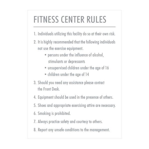 Keep guest safe and healthy while using the hotel gym by posting a brand-approved Fitness Center Rules sign in a highly visible are of the hotel gym. Sign features flat text and comes with foam tape on the back for easy mounting. For interior and exterior use.