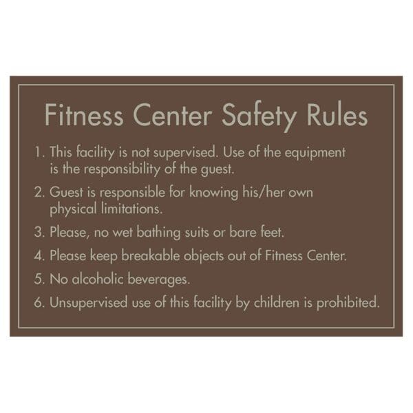 Brand-Approved Fitness center rules signs ensure that your guests remain safe and informed while using the hotel gym. Text on sign is flat and is for interior use only. Comes with foam tape for mounting.