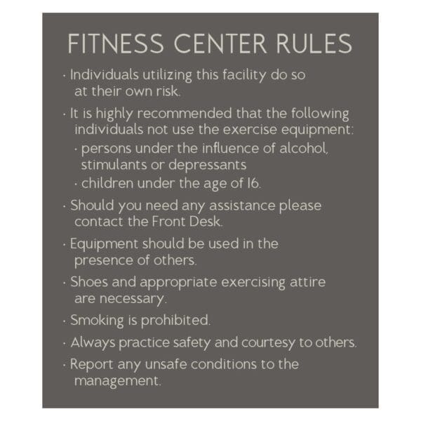 Help guests remain safe while using the fitness center by posting fitness center rule signs and informationals in an easy to see space.