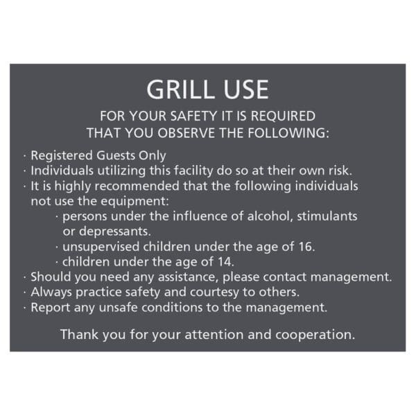 Keep guests safe while using the facility grill with signs that clearly state all grill use guidelines. Signs feature flat text and come with foam tape on the back for mounting.