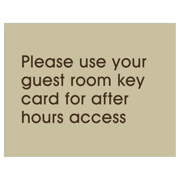 Inform guests when and where they have to use their key card to gain entry. Text on sign in digitally printed and comes with foam tape on the back for easy installation. For interior and exterior use.