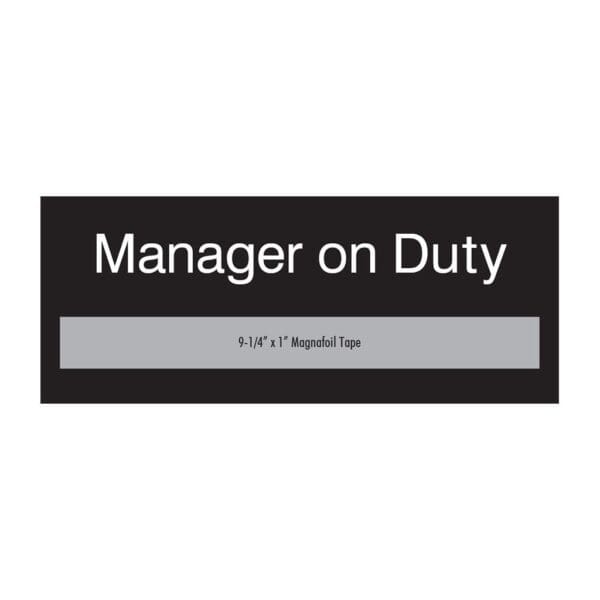 Manager on Duty holder signs are used to display the name of the on-duty hotel manager. Sign has flat copy, holder for manager name plate and foam tape on the back for easy mounting. For interior use only.