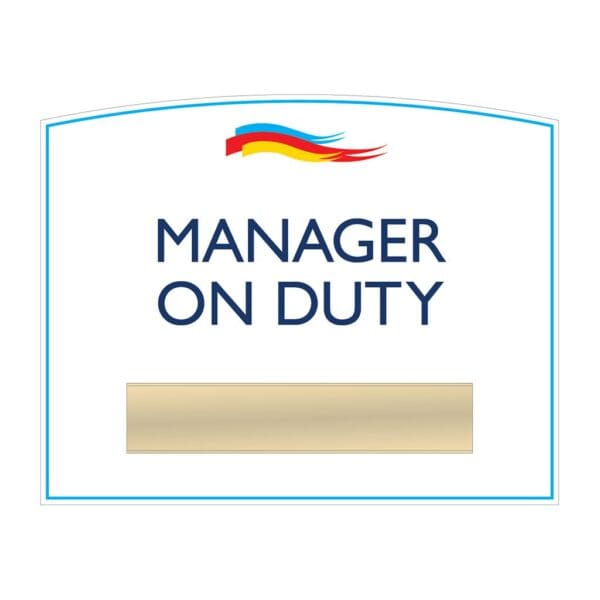 Manager on Duty holder signs are used to display the name of the on-duty hotel manager. Sign has tactile copy, holder for manager name plate and foam tape on the back for easy mounting.