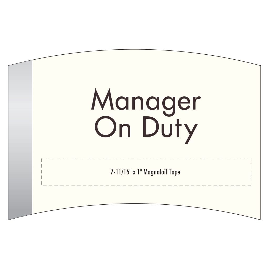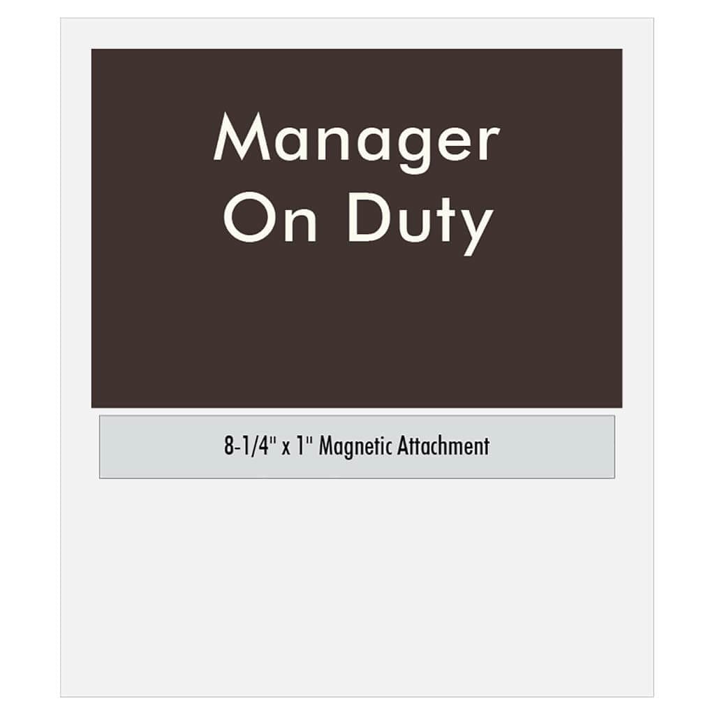 Manager of duty signs use digitally printed text and include space for an easily changeable nameplate to help guest identify the manager on duty. Signs come with foam tape on back for easy mounting.